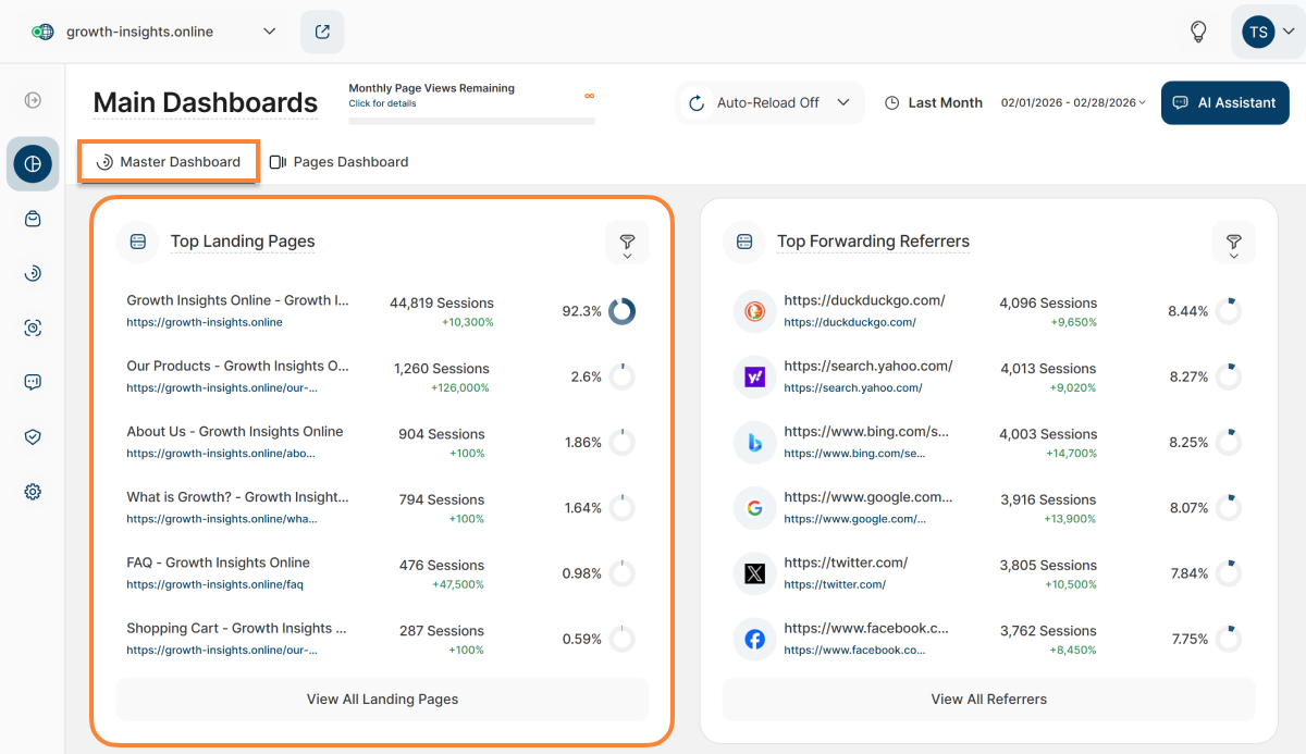 - Pages Dashboard: This section provides you with a thorough overview of your website’s pages and corresponding stats within the selected time period.