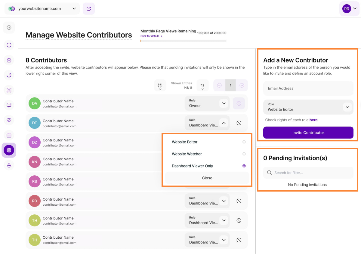 This submodule allows you to manage your website contributors with ease. This view is divided into three sections.