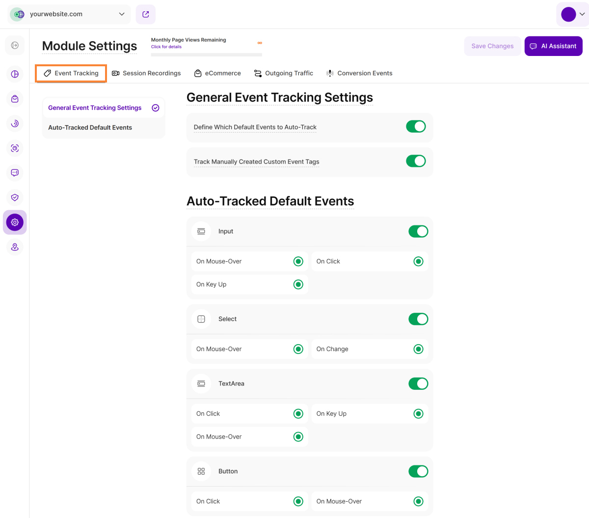 - If you have more than one website in your account, remember that these settings only apply to the selected website within the dropdown in the upper left corner of this view. If you want to apply a certain setting for all the websites added to your account, you need to repeat the setting for each website.