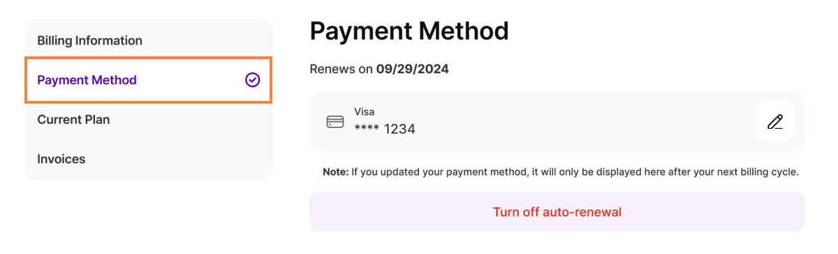 - If you updated your payment method, it will only be displayed here after your next billing cycle.
