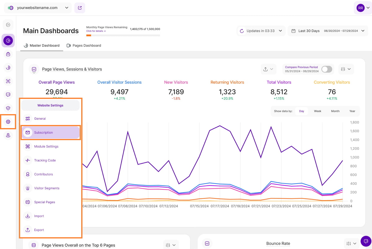In the Website Settings module, you can manage specific components of your website such as general settings, subscription, visitor segments, export and more. If you have more than one website to manage, you can switch between them using the drop-down menu in the top left corner.
