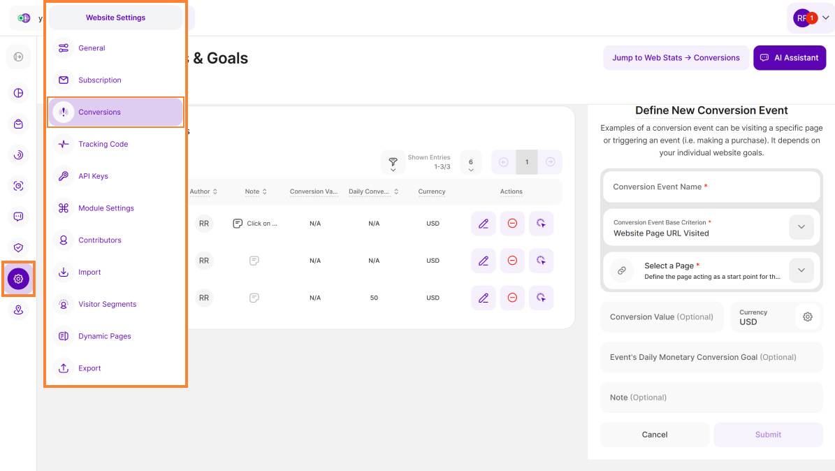 - Go to Website Settings > Conversions.