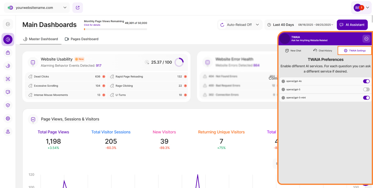 The AI Assistant button is in the top-right corner of the dashboard, right next to the date picker. When clicked, this button will open a modal sliding in from the right that hosts TWAIA, our AI-powered platform assistant.
