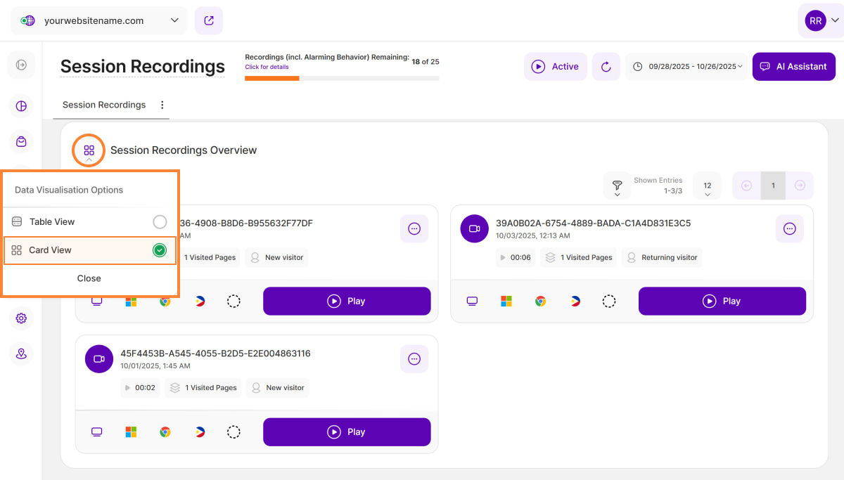 Alternatively, you can switch the view by tapping the Menu Icon on the top left of this report block, and then selecting "Card View" from the drop-down list. Instead of the default which is the table view discussed in the Session Recordings Overview, you will now see the session recordings individually displayed on each card.