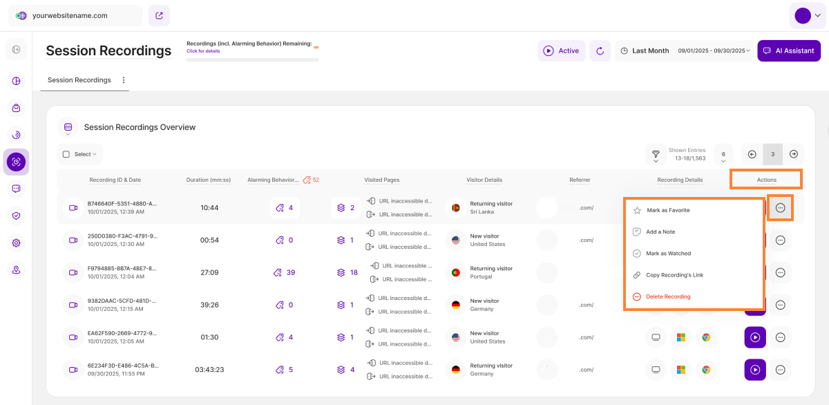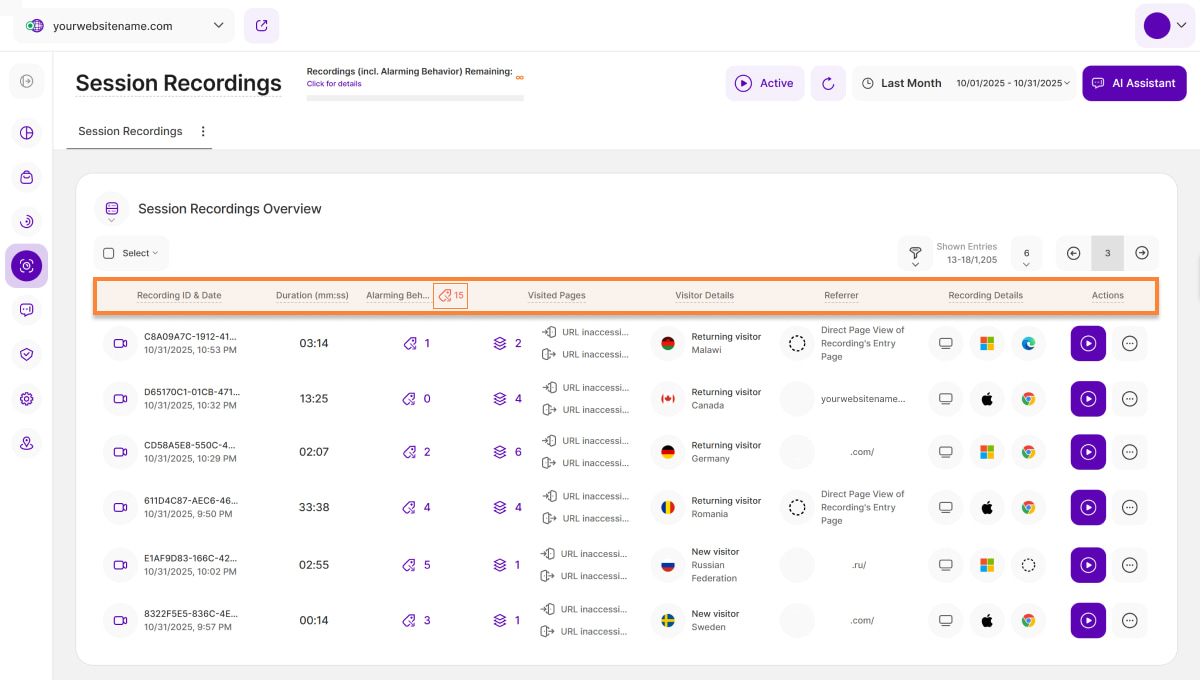 The Session Recordings Overview provides a comprehensive view of your visitors' session recordings, offering valuable insights into how they interact with your website. Each row in the table represents a visitor's session recording, encapsulating their interactions and details.