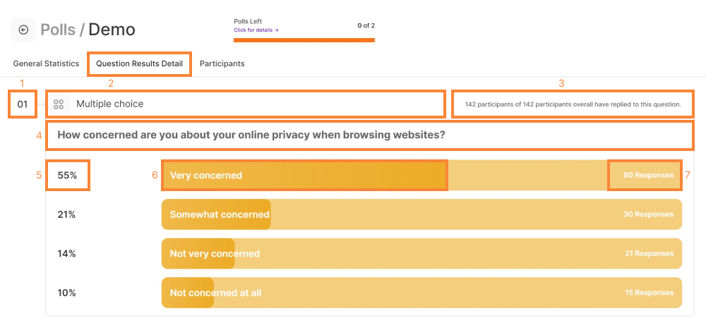 - Number of Participants who replied to this question: Shows both the number of participants who answered this question and the overall number of participants for the poll.