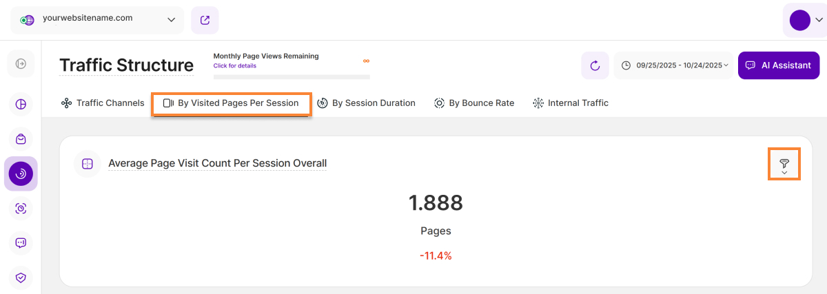 Now that you've explored your traffic sources, delve into engagement with the Visited Pages Per Session metric. This subtab is divided into two sections which will unlock insights into how visitors interact with your content: