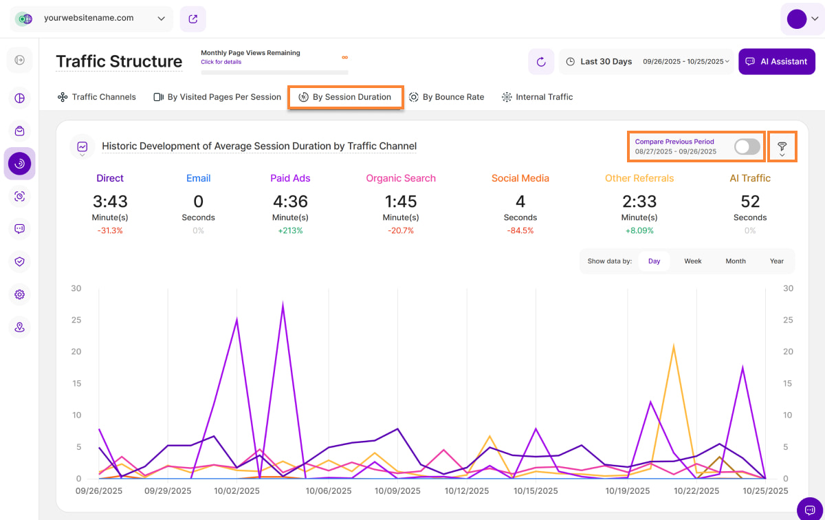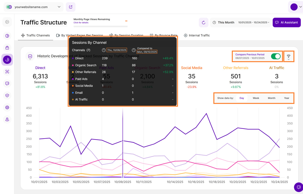 With a foundational understanding of your web traffic channels, you can now analyze traffic share trends by source. Each tab within the Traffic Structure submodule focuses on a particular aspect of the Historic Development of Tracked Sessions by Traffic Channel. The contained report blocks visualize how Key Performance Indicators (KPIs) have evolved over the chosen timeframe, segmented by traffic channel.