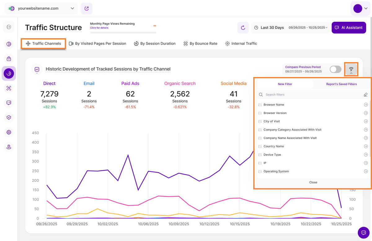 The Traffic Structure submodule provides invaluable insights into how visitors interact with your website. To gain granular understanding, filters are your most powerful tool.These filters are consistently available across all report blocks of this submodule, giving you the flexibility to apply one or several at once to segment and analyze your incoming traffic with high precision.