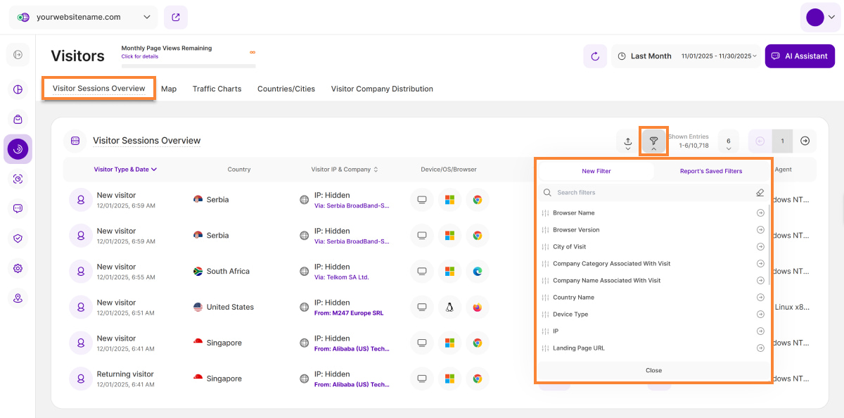 The Visitor Sessions Overview report blocknow features expanded filtering capabilities designed to empower you with greater control and deliver truly deeper insights. You can apply a wide range of filters, individually or in combination, and easily save these powerful configurations as custom templates for subsequent use.