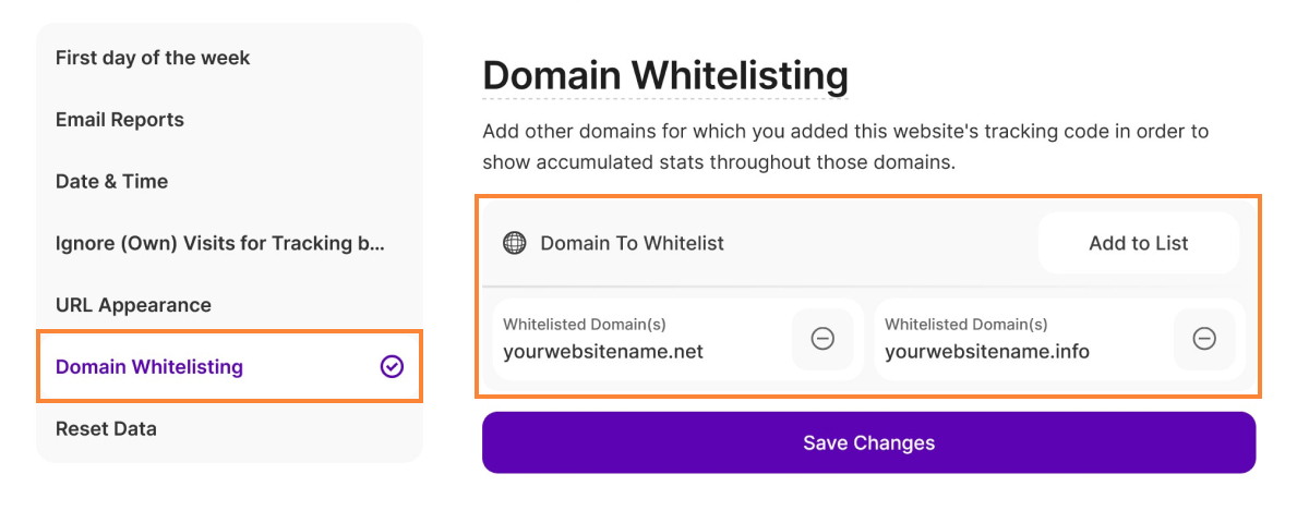 - By whitelisting a domain, you can include your website's tracking code on other domains or subdomains that you own and consider part of your website or business, such as landing pages, blogs, or temporary projects that you want to track.