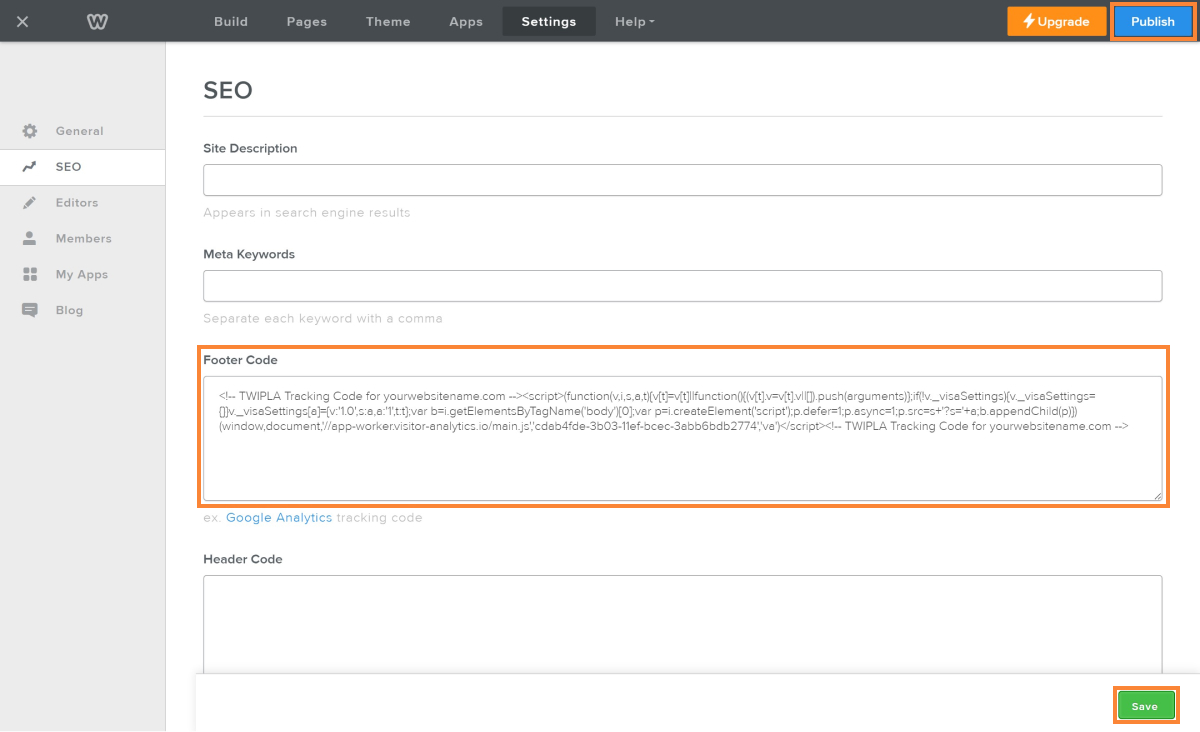 Note: The app will not start tracking your website yet, follow the steps below to get it started. - To activate tracking, go to the Weebly Website Editor, and click Publish to make your changes live.