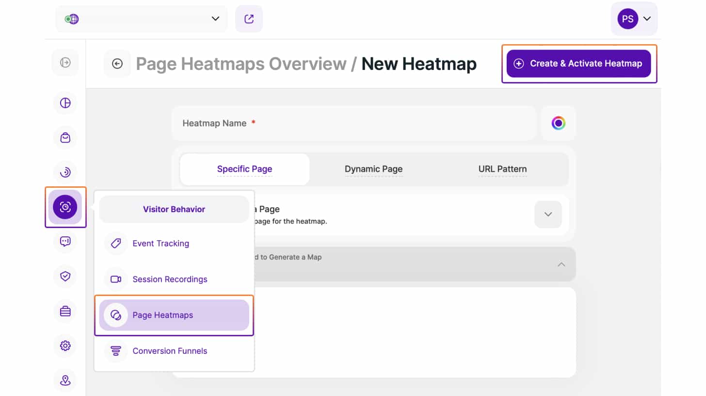- Go to Visitor Behavior in the vertical left-hand icon menu and click on Page Heatmaps.