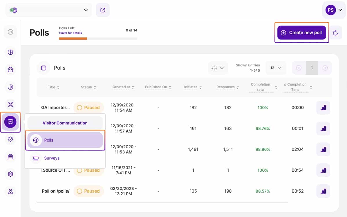 - Go to Visitor Communication in the vertical left-hand icon menu and click on Polls.