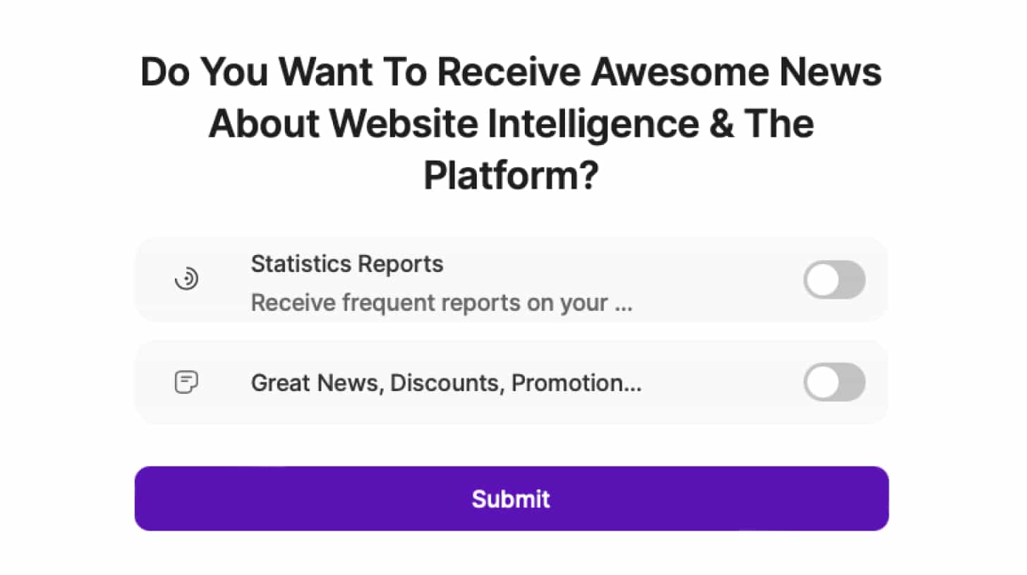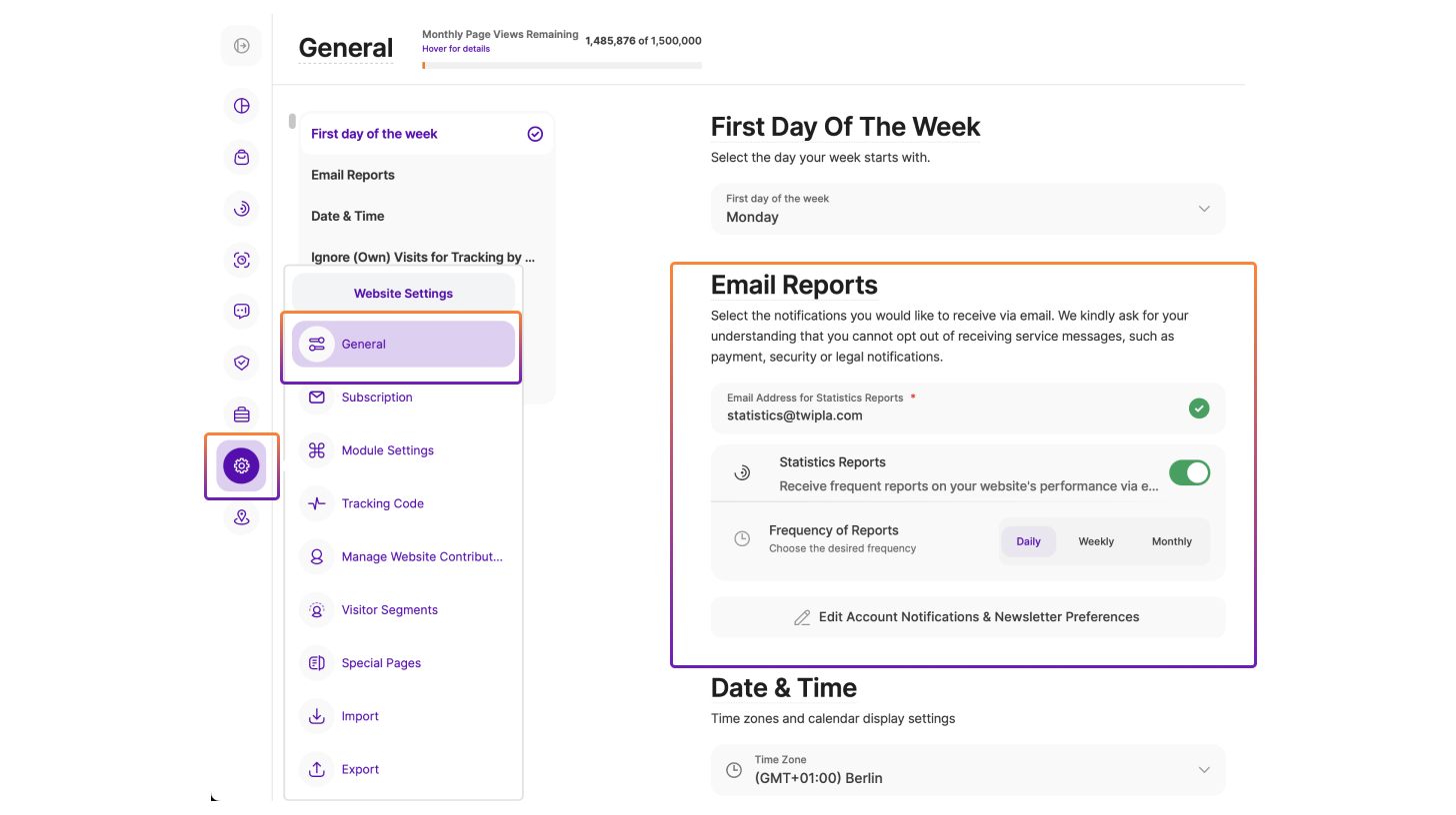 This onboarding step allows you to decide which email notifications to receive from the analytics platform and provider, and provides the opt-in consent we need for email contact. While optional, regularly-emailed Statistics Reports are an invaluable website intelligence aid for many of our users. You can turn these emails off here, or limit their frequency.