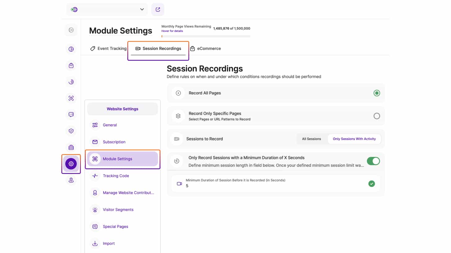 Hint: These settings are a great way to streamline the session replay library by removing the least interesting ones from consideration. Use it to adjust Session Recordings to record specific pages, only include active sessions, and set a minimum duration for the sessions recorded.