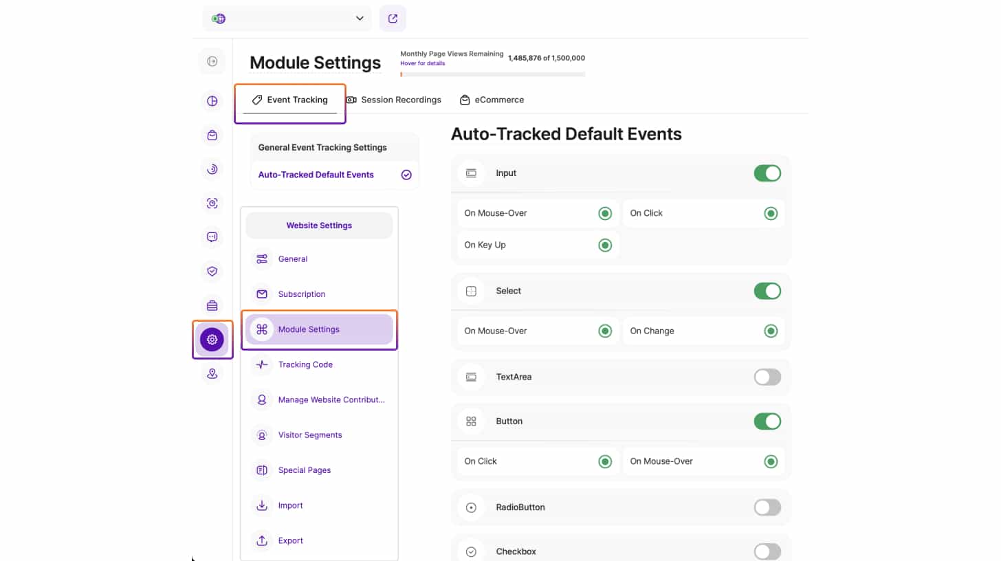 - Ensure that manual event tracking is enabled. Go to Website Settings in the vertical left-hand icon menu. Click on Module Settings. Toggle on Track Manually Created Event Tags.