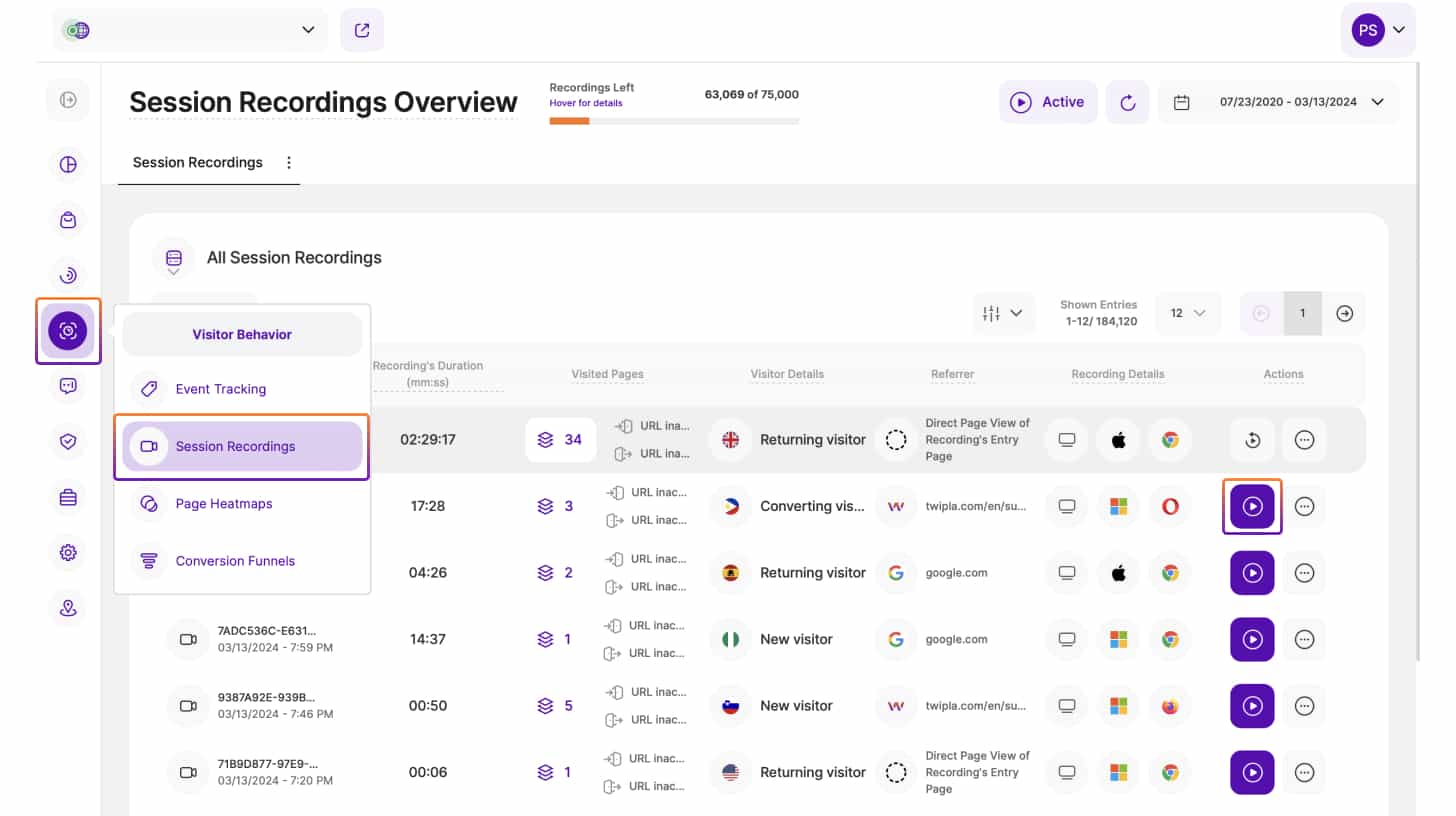 - Go to Visitor Behavior in the vertical left-hand icon menu and click on Session Recordings.