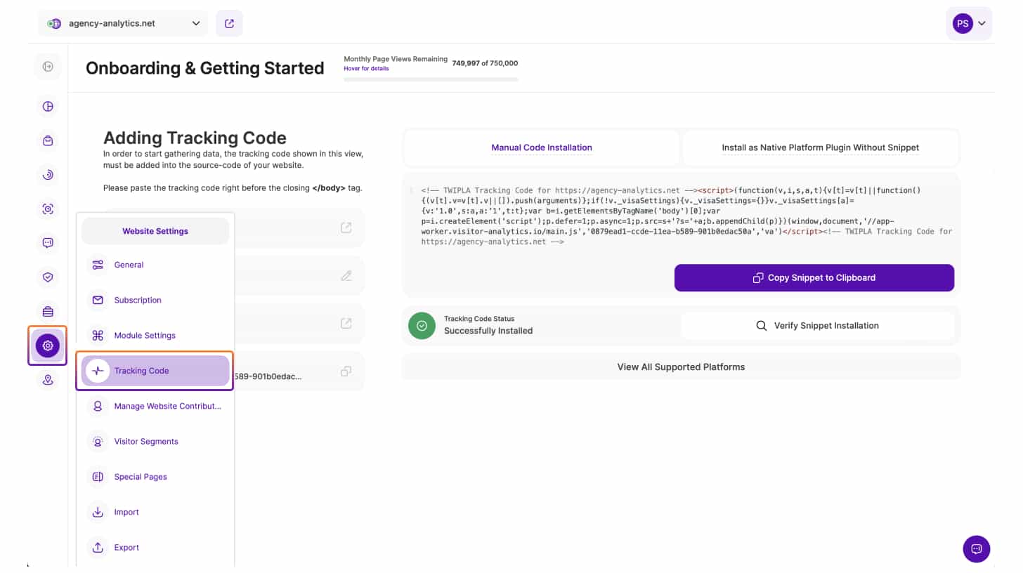 You now need to install the generated JavaScript snippet into website source code. Help is provided with Support Center links to tracking code installation guides for the most popular website building routes, including Wordpress, Google Tag Manager, Wix, Weebly, and TYPO3.